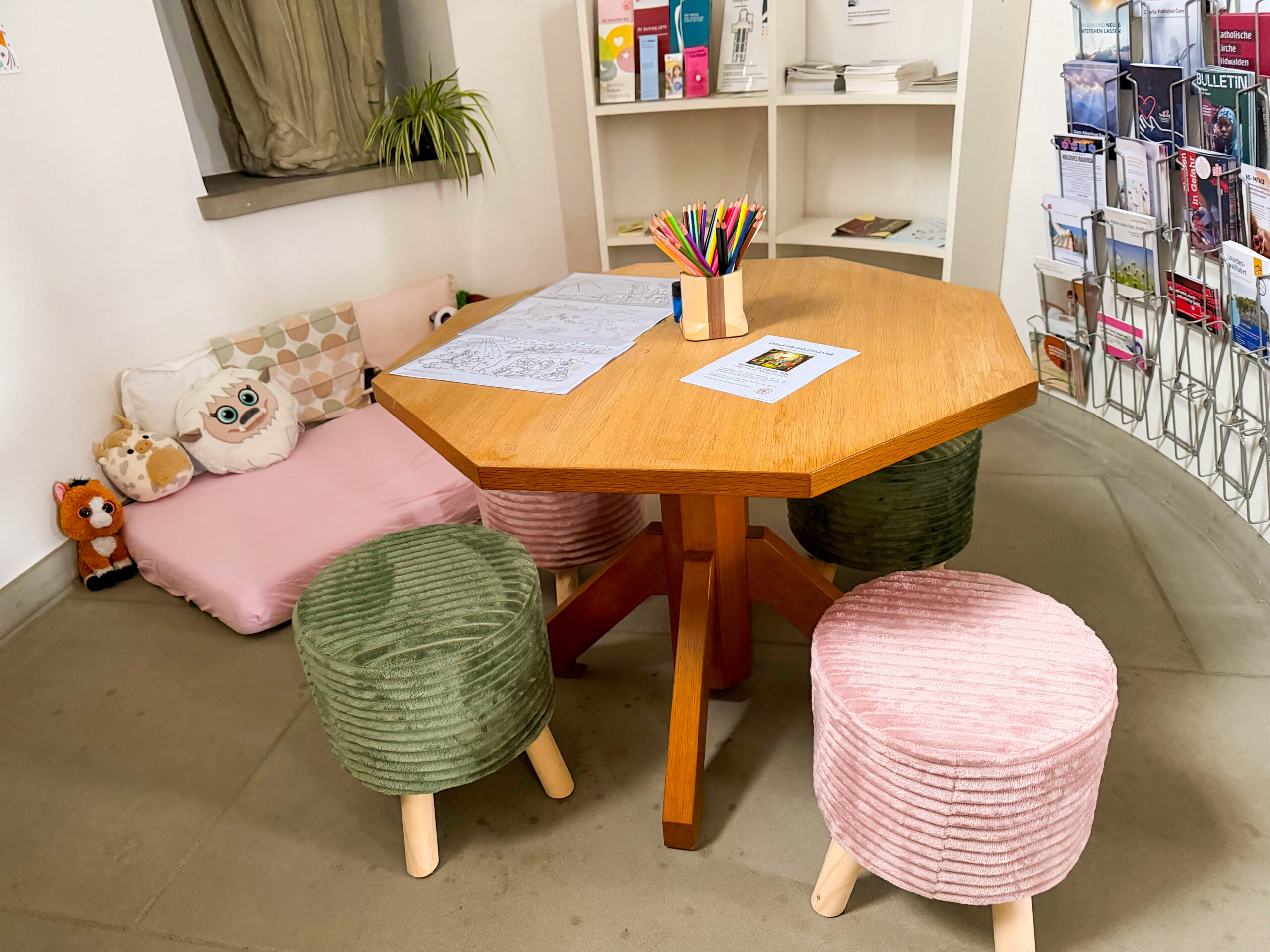 Wir freuen uns über Familien mit Kindern in unseren Gottesdiensten. In der neuen Kinderecke haben Kinder die Möglichkeit, auf ihre eigene Art dabei zu sein: beim Malen bunter Bilder, dem Anschauen von Bildernbüchern oder beim Ausruhen mit den lustigen Plüschtieren.